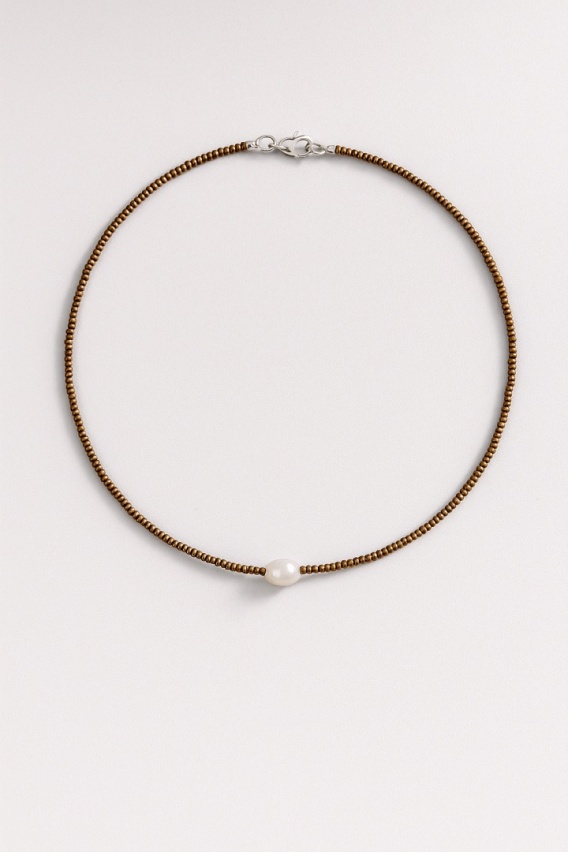 Naszyjnik wykonany z drobnych szklanych koralików z prawdziwą perłą hodowlaną. Naszyjnik ma długość ok 42cm, baza z matowych koralików w kolorze starego złota, perła wielkości 9mm x 6mm w kolorze ecru, wykończony posrebrzanym zapięciem.
