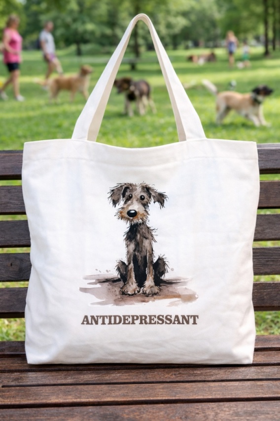 Duża torba uszyta z grubego płótna bawełnianego w kolorze białym, zapinana na zamek, w środku dodatkowo mała kieszonka również zapinana na zamek, żeby pomieścić wszystkie niezbędne drobiazgi. Torba została dodatkowo ozdobiona kolorowym nadrukiem z motywem PIESKA.