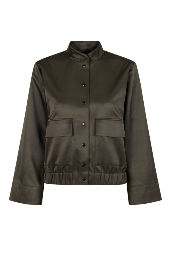 Elegancka kurtka uszyta z tkaniny wiskozowej typu ryps. Tkanina charakteryzuje się lekkim połyskiem. Kurtka jest w kolorze orzechowym, ozdobiona na plecach kontrastowym haftem. Forma w kształcie bomberki, zakończona na dole szeroką gumą. Rękawy proste, duże prostokątne kieszenie z klapką pomieszczą podręczne drobiazgi. Całośc zapinana na zatrzaski w kolorze grafitowym.