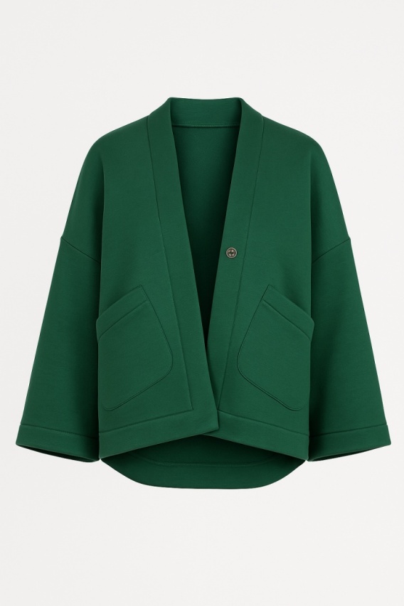 Niepowtarzalna narzuta oversize z grubej dzianiny dresowej, wykonana ręcznie według własnego projektu. Narzuta ma oversizową formę lekko zwężaną do dołu, szerokie długie rękawy dodają jej charakteru a zatrzask umieszczony na przodzie daje możliwość otulenia się w razie potrzeby.